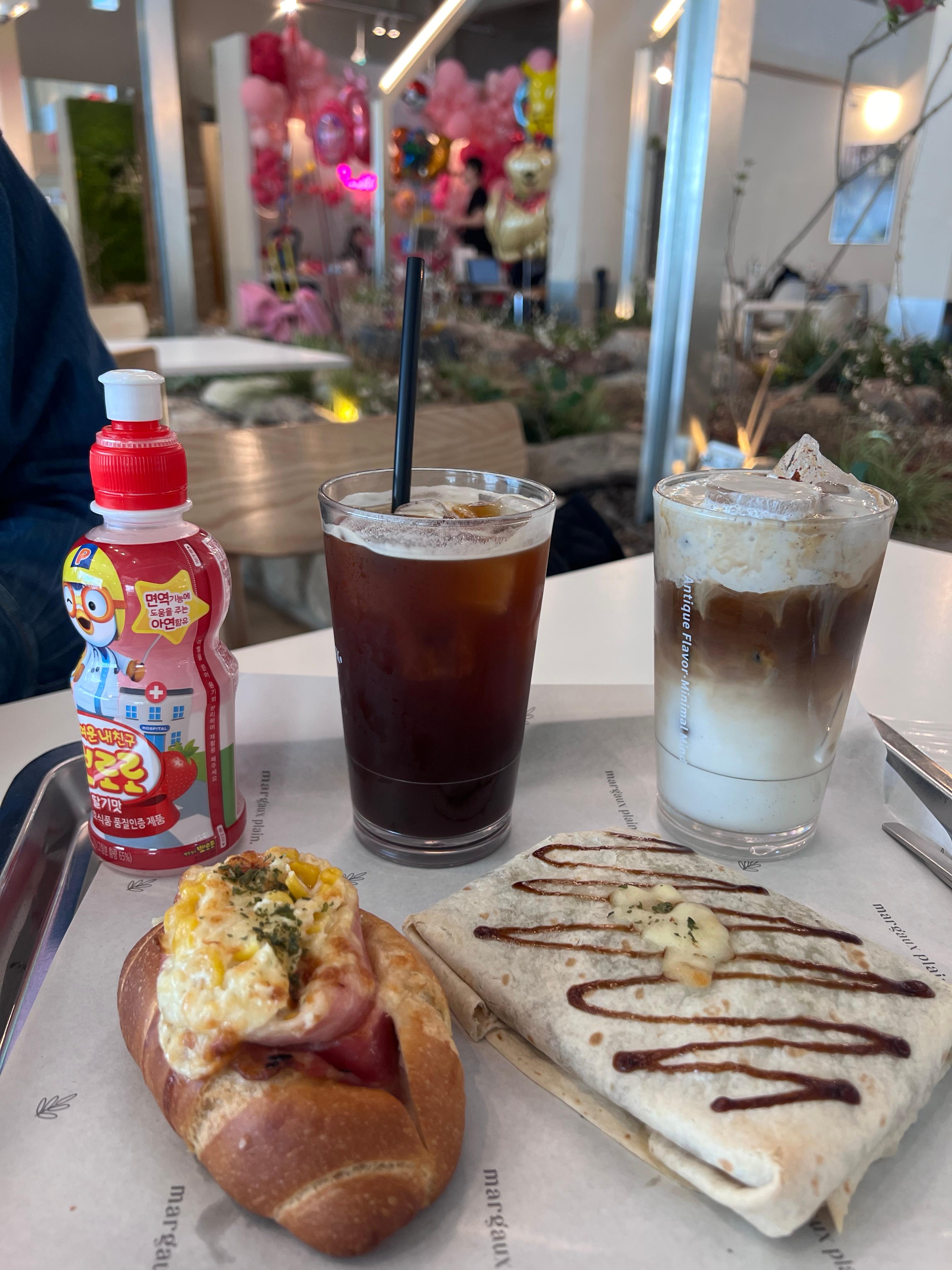 음료와 빵을 주문하고 자리 앉아서 대기줄로 오라는 방송을 기다립니다~
