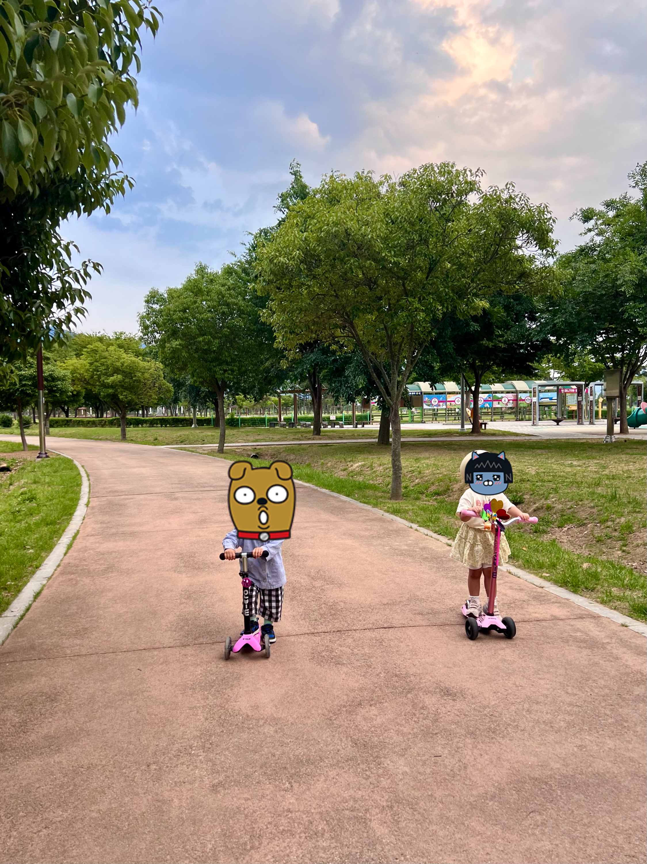 아이들이 킥보드 타기에 정말 좋은 길이라 지루할 틈이 없답니다.
